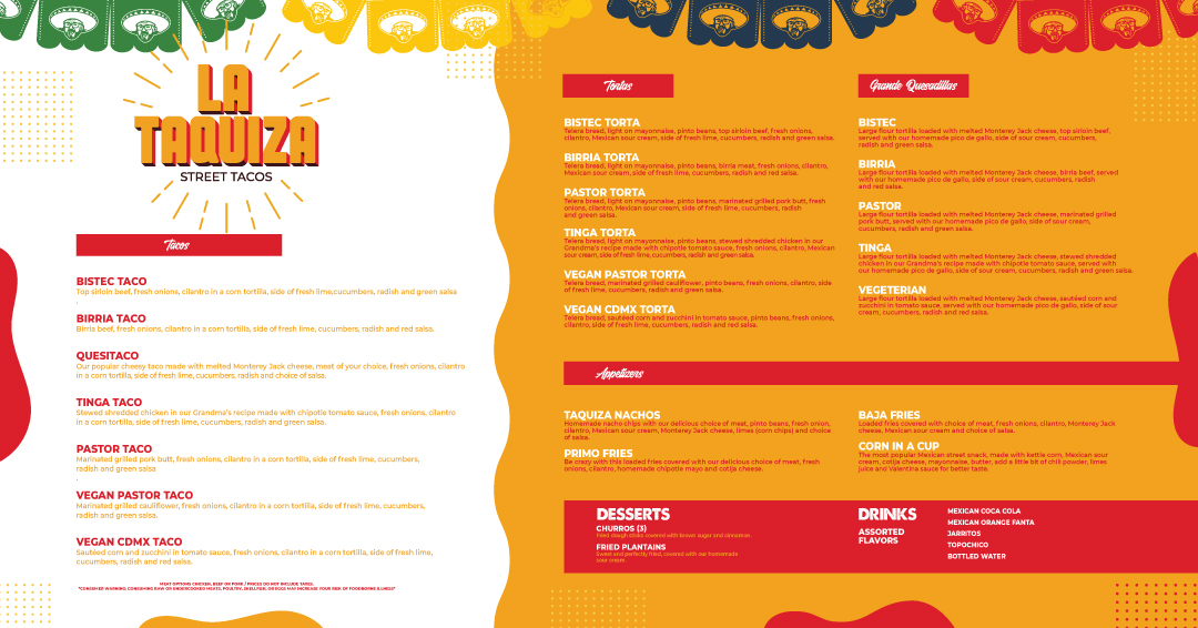 Located at 800 Capitol St, Houston, La Taquiza Street Tacos offers a vibrant culinary experience rooted in authentic Mexican flavors. The menu is crafted with care, featuring an array of mouthwatering tacos that allow you to choose your favorite protein, paired with fresh toppings like onions, cilantro, and zesty salsas, all for just $3.99. Don’t miss their tortas, generously stuffed on soft Telera bread, or the grande quesadilla, bursting with Monterey jack cheese.